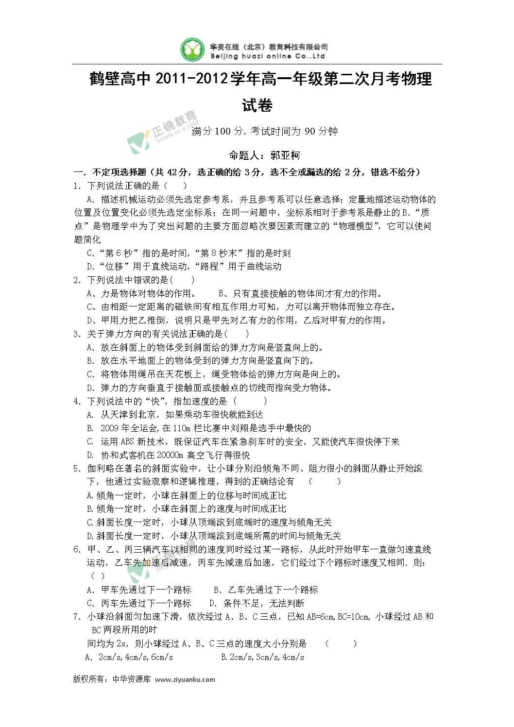 商丘市第一高级中学2025-2026学年高一上学期十月份阶段性测试物理试卷