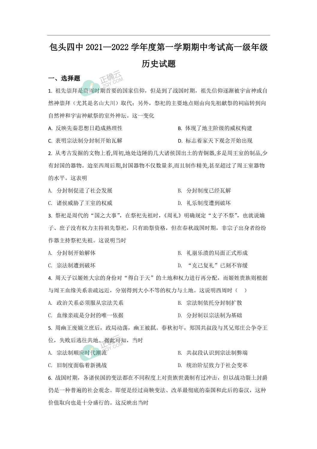 通辽市第一中学2025-2026学年高一上学期第一次月考历史试卷