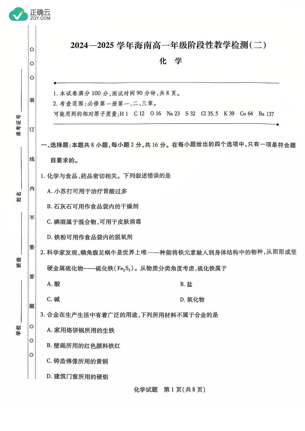 海南省部分学校2024-2025学年高一上学期阶段教学检测(二)化学试卷